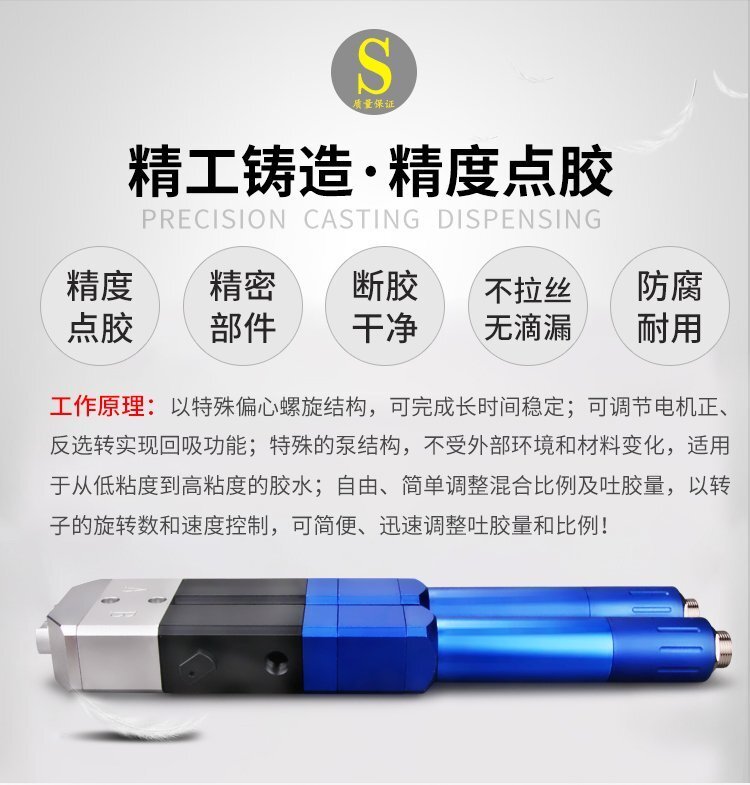 螺桿閥特點:精密螺桿閥外形輕巧,方便手握;操作簡單,靈活性強,點膠精度高。螺桿閥的應用領域:適用于焊錫膏,銀漿,紅膠,油脂,UV膠,硅膠等,應用于焊錫膏焊接,芯片粘結,芯片封裝,圍壩等工藝采用Z向旋轉螺桿進行物料輸送,解決了氣壓點膠方式,由于氣體的可縮性所帶來的脈動,出膠量不一致的問題。電機正反轉分別控制,正向旋轉可使用物料按照需要的流量被均勻擠出,反向旋轉可實現熱熔膠的回吸,避免漏膠,拉絲等現象適合工程/工廠長期生產使用;有大量現貨供應,歡迎咨詢采購!