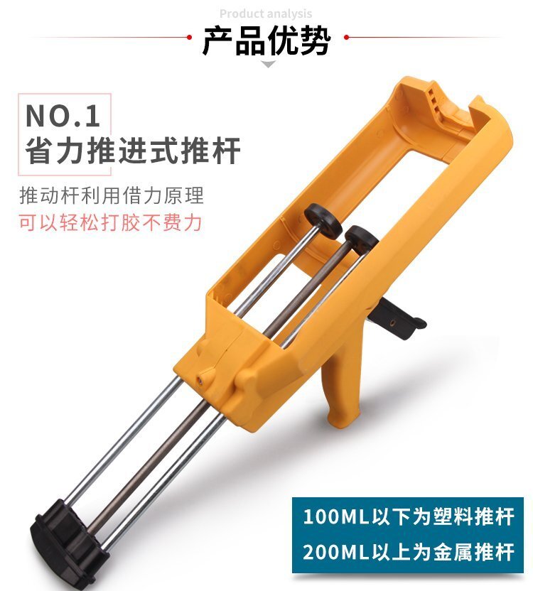 此款膠槍為200毫升AB膠筒1:1專用,推桿式結構,打膠高效省力;外殼采用特殊材料制造,不易斷裂,推桿使用質密金屬材質,耐力性好,不彎曲變形,適合工程/工廠長期生產使用;有大量現貨供應,歡迎咨詢采購!